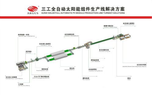 武汉三工光电光伏组件生产设备包括:输送机、全自动串焊机、组件排版机、上料机、EL检测机(包含前及终检)、IV检测机、翻转机、自动打胶机、自动修边机、自动组框机、堆栈机、固化线、分选码垛机及相关光伏组件检测实验等设备。该方案设备流水线布局科学、合理、美观,性价比较高,操作维护方便。
