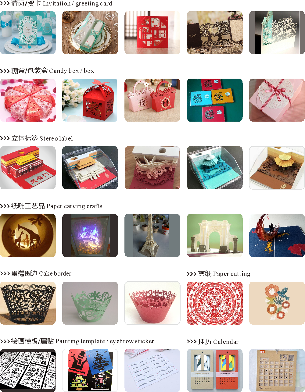 该设备适用于贺卡、喜帖、糖盒、剪纸、3D纸雕灯、绘画模板、纸质工艺品等各种纸质材料的雕刻、切割、镂空制作。
