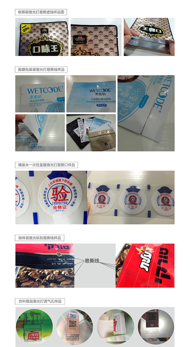 武汉三工激光是国内率先针对薄膜包装行业提出激光代替机械加工工艺的企业,专为薄膜易撕线、定量透气孔而设计与开发的。与传统的机械齿轮压孔相比速度更快,孔径孔距大小可调更加均匀,可以实现任意方向任意形状易撕孔(线)标刻。激光工艺制作是一种瞬间高温处理使孔周围热融保护,因此完全解决了后期热收缩后出现的断裂现象,在手感上也非常平滑,在感官上给客户一种新的体验。激光易撕线和透气孔的诸多优势我们前面已经讲到过很多,再次不做赘述,下面一起来看一下我们易撕线激光打孔划线机做的不同行业以及材料的样品吧!