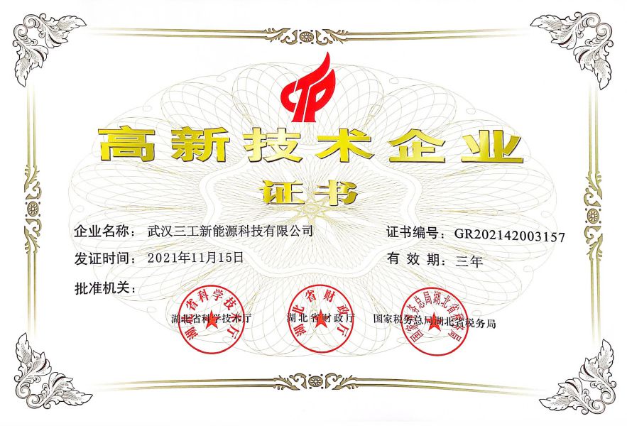 2021年三工新能源荣获湖北省“高新技术企业证书”
