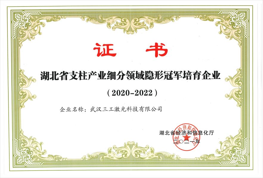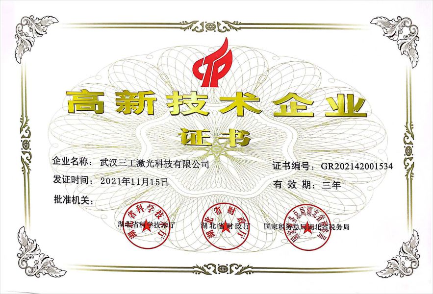 2021年三工激光荣获湖北省“高新技术企业证书”